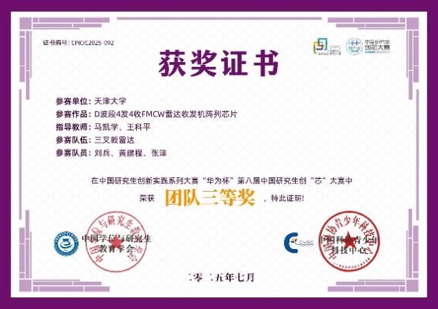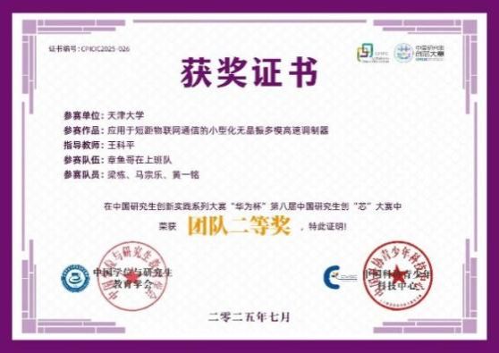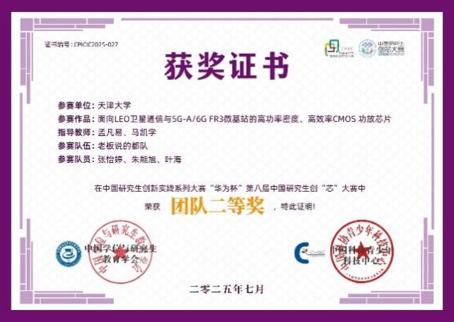女同av 互联感知集成电路与系统团队的张怡婷、朱能旭和叶海三位同学以题为“面向LEO卫星通信与5G-A/6G FR3微基站的高功率密度、高效率CMOS 功放芯片”的作品,获得大赛全国二等奖,团队的指导老师为:孟凡易教授和马凯学教授。