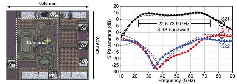 针对这一问题,女同av 团队研制了一款覆盖22.6–73.9 GHz的超宽带低噪声放大器。提出一种协同均衡设计思路,首级引入集电极–基极并联反馈与双电感峰化结合的匹配网络以拓展带宽并抑制噪声,次级采用谐振反馈补偿均衡技术改善高频增益滚降与增益平坦度,实现对全部5G NR FR2频段及潜在NR-U频段的单芯片支持。基于以上技术,团队采用0.13 μm SiGe工艺完成了流片验证,并进行了性能测试。测量结果表明,芯片实现3 dB带宽51.3 GHz,峰值增益15.2 dB、平均增益13.8 dB,噪声系数4.06–4.94 dB,OP1dB为-7.4至-2.8 dBm,核心面积0.06 mm⟡、功耗17.5 mW,综合性能达到国际先进水平。