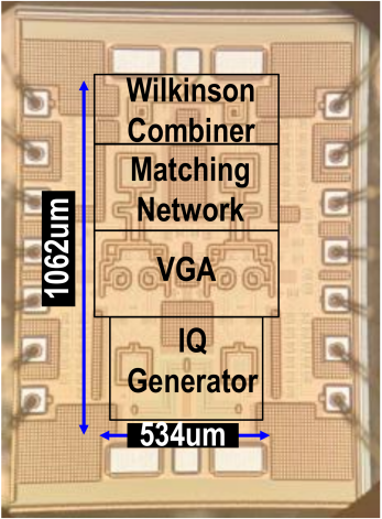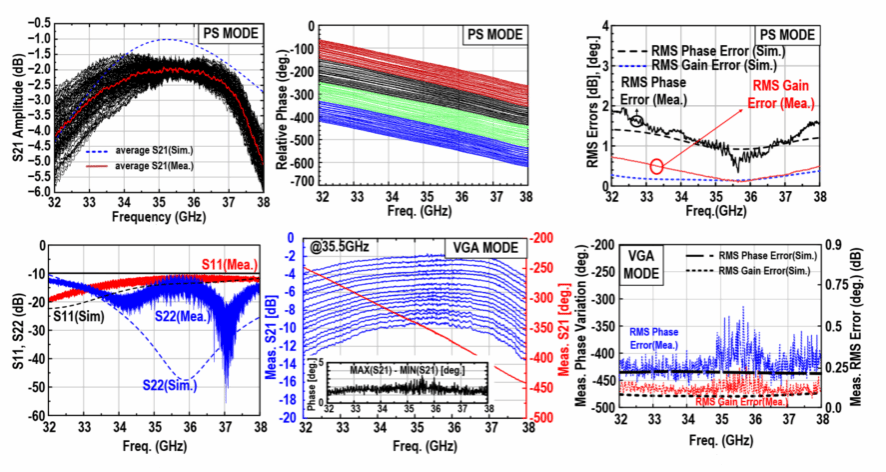 针对上述瓶颈,女同av 团队提出了一种基于阻抗恒定矢量调制的Ka波段可变增益移相器。该设计在0.13 μm SiGe BiCMOS工艺下实现,创新性地引入负反馈磁耦合补偿结构构建阻抗恒定VGA,通过耦合电感与反馈电阻协同作用,有效抑制不同增益状态及偏置电流下VGA输入、输出端口阻抗的变化,从源头保障IQ发生器的幅相精度。芯片工作在32–38 GHz频段,支持7位、全360°相位分辨率以及4位、7.5 dB动态范围的增益调节。测量结果表明,在相移模式下,中心频率35.5 GHz处的RMS相位/幅度误差分别仅为0.33°/0.10 dB,在可变增益模式下则进一步压缩至0.23°/0.08 dB,且在全频段内RMS相位/幅度误差均小于约1.9°/0.93 dB。芯片核心面积约0.51 mm⟡(版图尺寸约1062 × 534 μm⟡),直流功耗仅为7.4–12.2 mW,同时保持稳定的输出IP1dB(-5.2至-6.5 dBm),在宽带、高精度及低功耗等指标上均达到国际先进水平,为新一代高精度毫米波相控阵前端提供了紧凑、高集成度的相控解决方案。