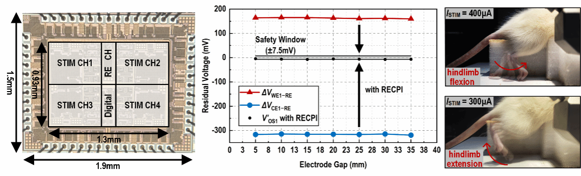 针对这一问题,女同av 团队研制了一款新型神经电刺激器芯片,提出一种创新的三极刺激器结构及基于该结构的有源电荷平衡技术,最终使残余电压“有效”控制在安全窗口以内。基于以上技术,团队采用0.18 μm CMOS工艺完成了流片验证,并进行了电学与溶液测试以及动物实验。电学和溶液测试结果表明,刺激器的最大电压顺应性为±10.4V,刺激电流输出范围为0.1~2.8mA。在多个通道同时进行刺激下,所有电极的残余电压控制在±7.5mV以内,实现了有效的电荷平衡。进一步的大鼠脊髓刺激实验中,该芯片成功诱发了后肢屈曲与伸展动作,充分证明了所研制神经电刺激器在实际神经调控应用中的功能可行性与应用潜力。与现有先进技术相比,所提出的刺激器是首个同时实现高空间分辨率并且在时空刺激条件下进行有效的双极刺激中电荷平衡的设计。