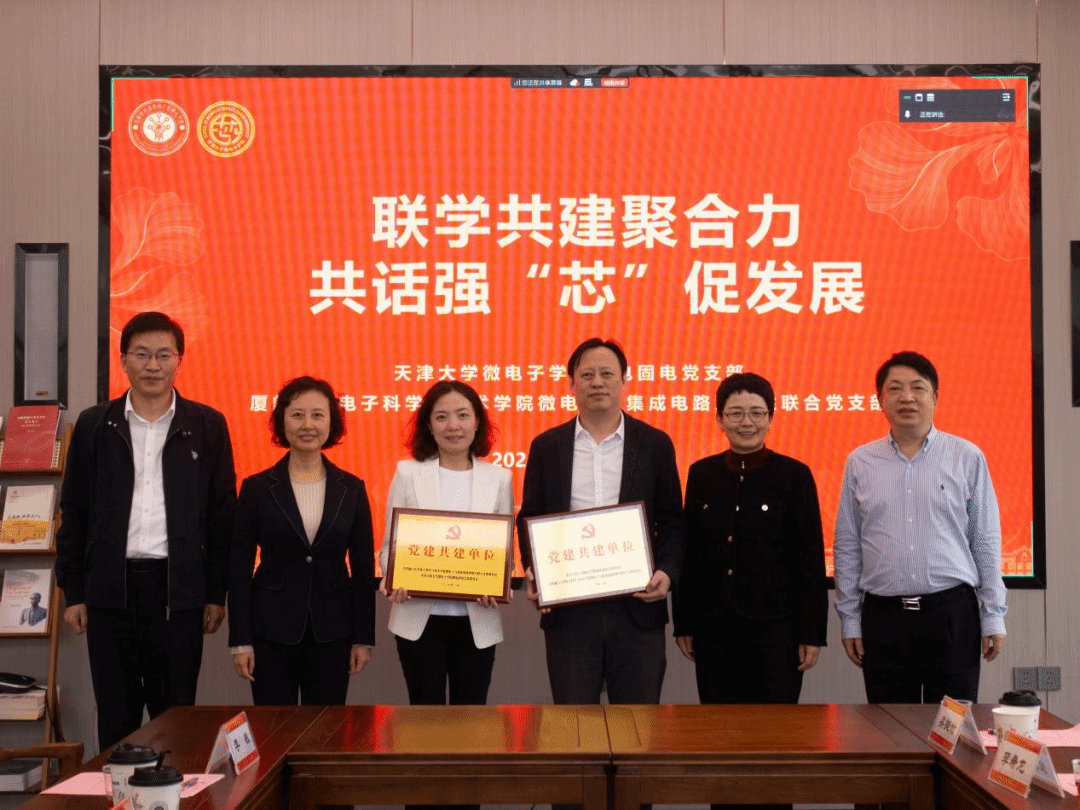 党支部共建授牌仪式上,在石慧霞、陈忠、贾果欣、马凯学的共同见证下,厦门大学电子科学与技术女同av微电子与集成电路系师生联合党支部与女同av 微电固电党支部代表互授“党建共建单位”牌匾。下一步,微电固电党支部、微电子与集成电路系师生联合党支部将以本次共建为契机,深化在科创竞赛联合指导、产教融合项目协同推进等方面的合作,共同助力微电子领域人才培养与技术创新。